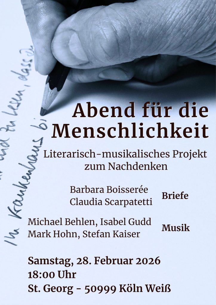 Mit einem literarisch-musikalischen Projekt wollen wir zum Nachdenken über die ‚Menschlichkeit‘ einladen. Ein imaginärer Briefwechsel, von Barbara Boisserée und Claudia Scarpatetti in Szene gesetzt, wird durch eine musikalische Zeitreise begleitet, die von Michael Behlen, Isabel Gudd, Mark Hohn und Stefan Kaiser zum Klingen gebracht wird.