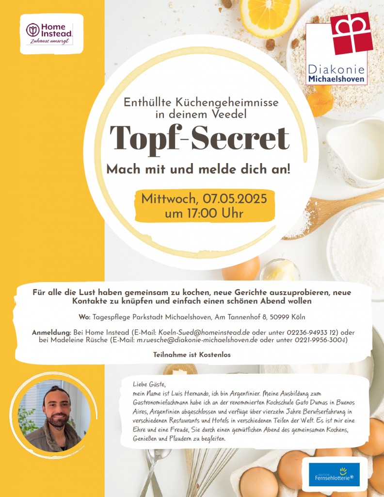![]() Für alle die Lust haben gemeinsam zu kochen, neue Gerichte auszuprobieren, neue Kontakte zu knüpfen und einfach einen schönen Abend wollen Wo: Tagespflege Parkstadt Michaelshoven, Am Tannenhof 8, 50999 Köln Anmeldung: Bei Home Instead (E-Mail: Koeln-Sued@homeinstead.de oder unter 02236-94933 12) oder bei Madeleine Rüsche (E-Mail: m.ruesche@diakonie-michaelshoven.de oder unter 0221-9956-3004) Teilnahme ist KostenlosDieser Eintrag wird Ihnen […] |