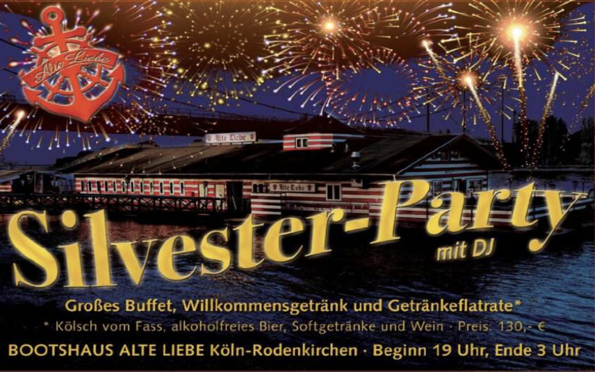 ![]() BOCK AUF PARTY ? Wir werden in diesem Jahr wieder mit einzigartiger Atmosphäre das alte Jahr den Rhein runterfließen lassen. Die Karten sind vor Ort erhältlich.Dieser Eintrag wird Ihnen zur Verfügung gestellt vom Kölner BilderBogen - eines der beliebtesten Stadtmagazine in Köln. Ihr Termin fehlt? Einfach kostenlos einreichen: www.bilderbogen.de/eventeintrag