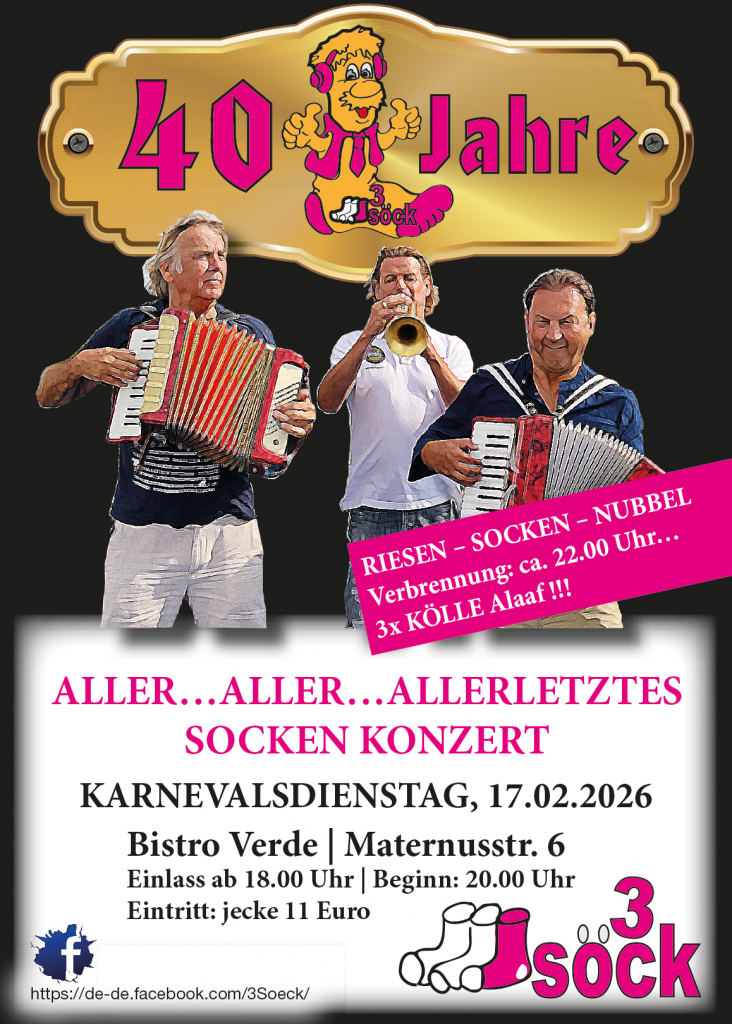 RIESEN – SOCKEN – NUBBEL Verbrennung: ca. 22.00 Uhr…3x KÖLLE Alaaf !!! Eintritt: jecke 11,00 Euro ….bringt SOCKEN mit… Eure 3 SÖCK Dieser Eintrag wird Ihnen zur Verfügung gestellt vom Kölner BilderBogen - eines der beliebtesten Stadtmagazine in Köln. Ihr Termin fehlt? Einfach kostenlos einreichen: www.bilderbogen.de/eventeintrag