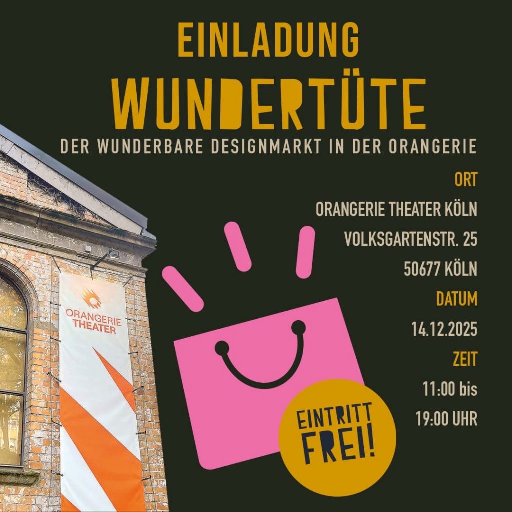 Orangerie Theater im Volksgarten Kön Volksgartenstr. 25, KölnAm 14.12.25 findet im Kölner Orangerie Theater in der Südstadt wieder die Ausstellung der Wundertüte statt. In Foyer und neuem, vergrößertem Theatersaal zeigen 17 Aussteller:innen ihre handgefertigten Unikate: Mode, Schmuck, Textiles, Keramik, Lederaccessoires, Holzobjekte, Malerei und kulinarische Highlights.Dieser Eintrag wird Ihnen zur Verfügung gestellt vom Kölner BilderBogen - eines der beliebtesten Stadtmagazine in Köln. Ihr […]