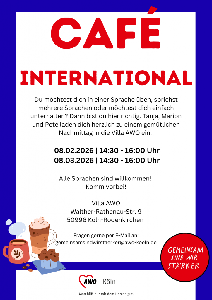 Villa AWO Walther-Rathenau-Str. 9, Köln, NRW, DeutschlandMarion, Tanja und Peter laden alle, die Lust haben neue Menschen kennenzulernen und eine nette Zeit bei einer Tasse Kaffee miteinander zu verbringen, herzlich in die Villa AWO ein. Spenden sind herzlich willkommen! Foto: AWODieser Eintrag wird Ihnen zur Verfügung gestellt vom Kölner BilderBogen - eines der beliebtesten Stadtmagazine in Köln. Ihr Termin fehlt? Einfach […]