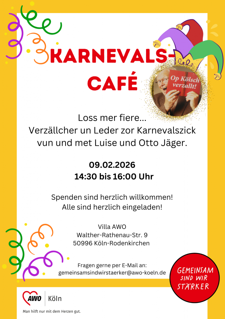 Villa AWO Walther-Rathenau-Str. 9, Köln, NRW, DeutschlandLoss mer fiere… Verzällcher un Leder zor Karnevalszick vun und met Luise und Otto Jäger. Wir freuen uns auf die gemeinsame Zeit mit Ihnen Spenden sind herzlich willkommen! Foto: AWODieser Eintrag wird Ihnen zur Verfügung gestellt vom Kölner BilderBogen - eines der beliebtesten Stadtmagazine in Köln. Ihr Termin fehlt? Einfach kostenlos einreichen: www.bilderbogen.de/eventeintrag