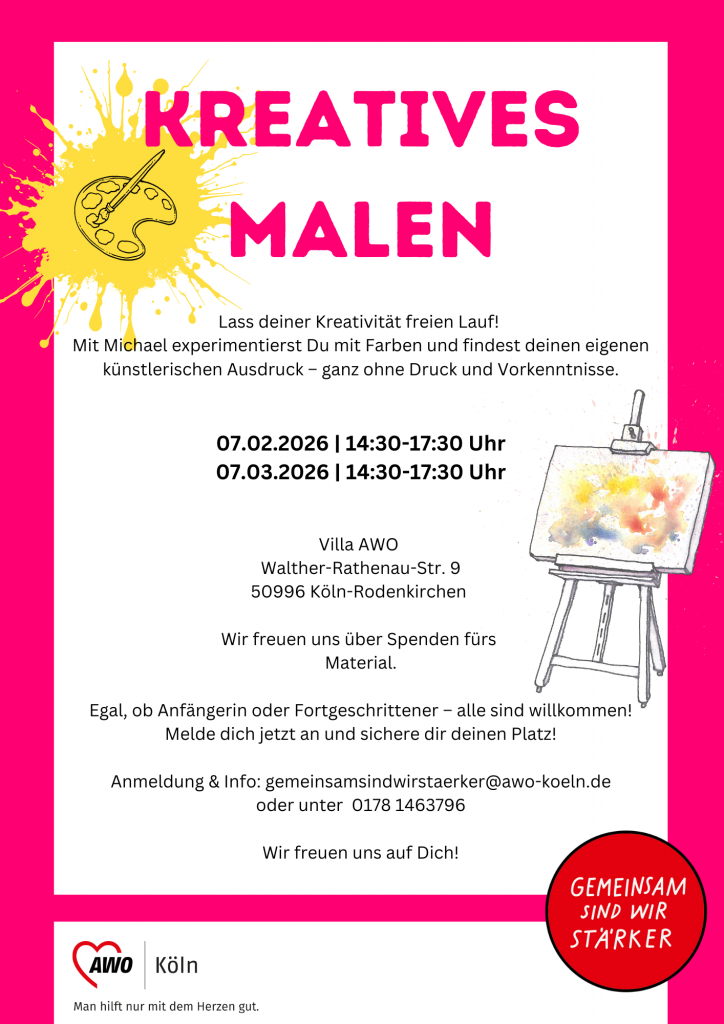 Villa AWO Walther-Rathenau-Str. 9, Köln, NRW, DeutschlandLass deiner Kreativität freien Lauf! Vorkenntnisse sind nicht nötig. Anmeldung erforderlich unter: 0178 1463 796 . Spenden für die Materialien sind herzlich willkommen. Foto: AWODieser Eintrag wird Ihnen zur Verfügung gestellt vom Kölner BilderBogen - eines der beliebtesten Stadtmagazine in Köln. Ihr Termin fehlt? Einfach kostenlos einreichen: www.bilderbogen.de/eventeintrag