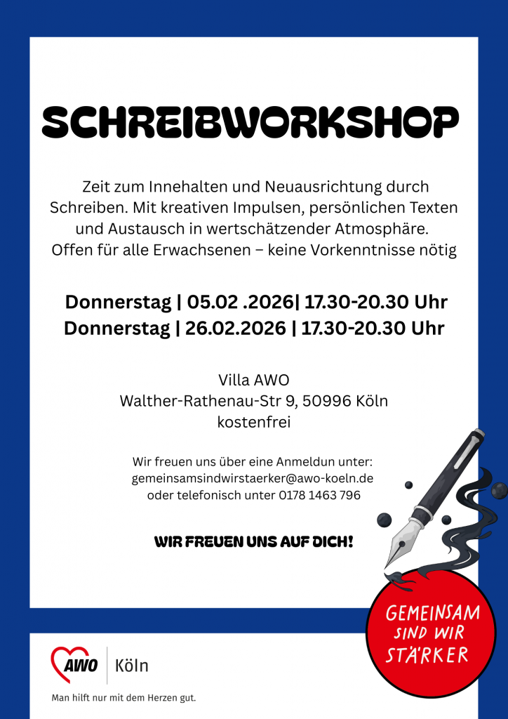 Villa AWO Walther-Rathenau-Str. 9, Köln, NRW, DeutschlandZeit zum Innehalten und für eine Neuausrichtung durch Schreiben. Offen für alle Erwachsenen – keine Vorkenntnisse nötig. Spenden sind herzlich willkommen. Foto: AWODieser Eintrag wird Ihnen zur Verfügung gestellt vom Kölner BilderBogen - eines der beliebtesten Stadtmagazine in Köln. Ihr Termin fehlt? Einfach kostenlos einreichen: www.bilderbogen.de/eventeintrag
