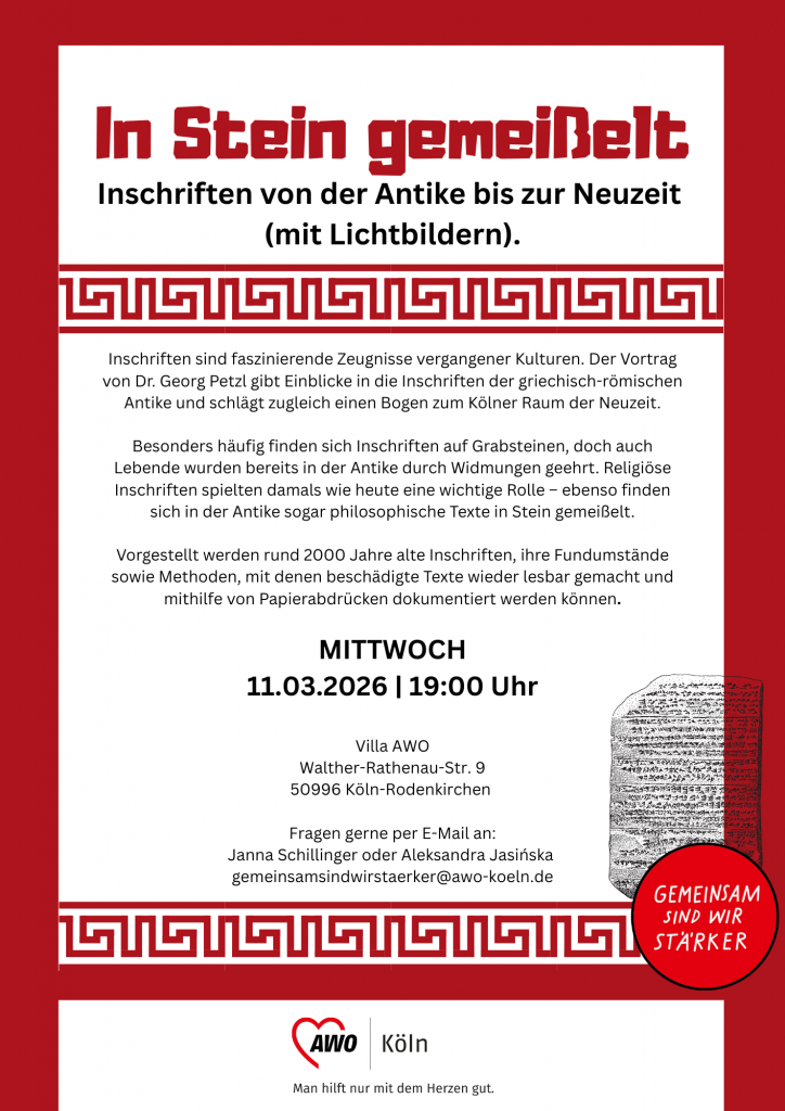 Villa AWO Walther-Rathenau-Str. 9, Köln, NRW, DeutschlandInschriften von der Antike bis zur Neuzeit: Inhalt, Fundumstände, Technisches. Mit Lichtbildern. Vortrag (45 Min.) mit anschließender Diskussion. Foto: AWODieser Eintrag wird Ihnen zur Verfügung gestellt vom Kölner BilderBogen - eines der beliebtesten Stadtmagazine in Köln. Ihr Termin fehlt? Einfach kostenlos einreichen: www.bilderbogen.de/eventeintrag